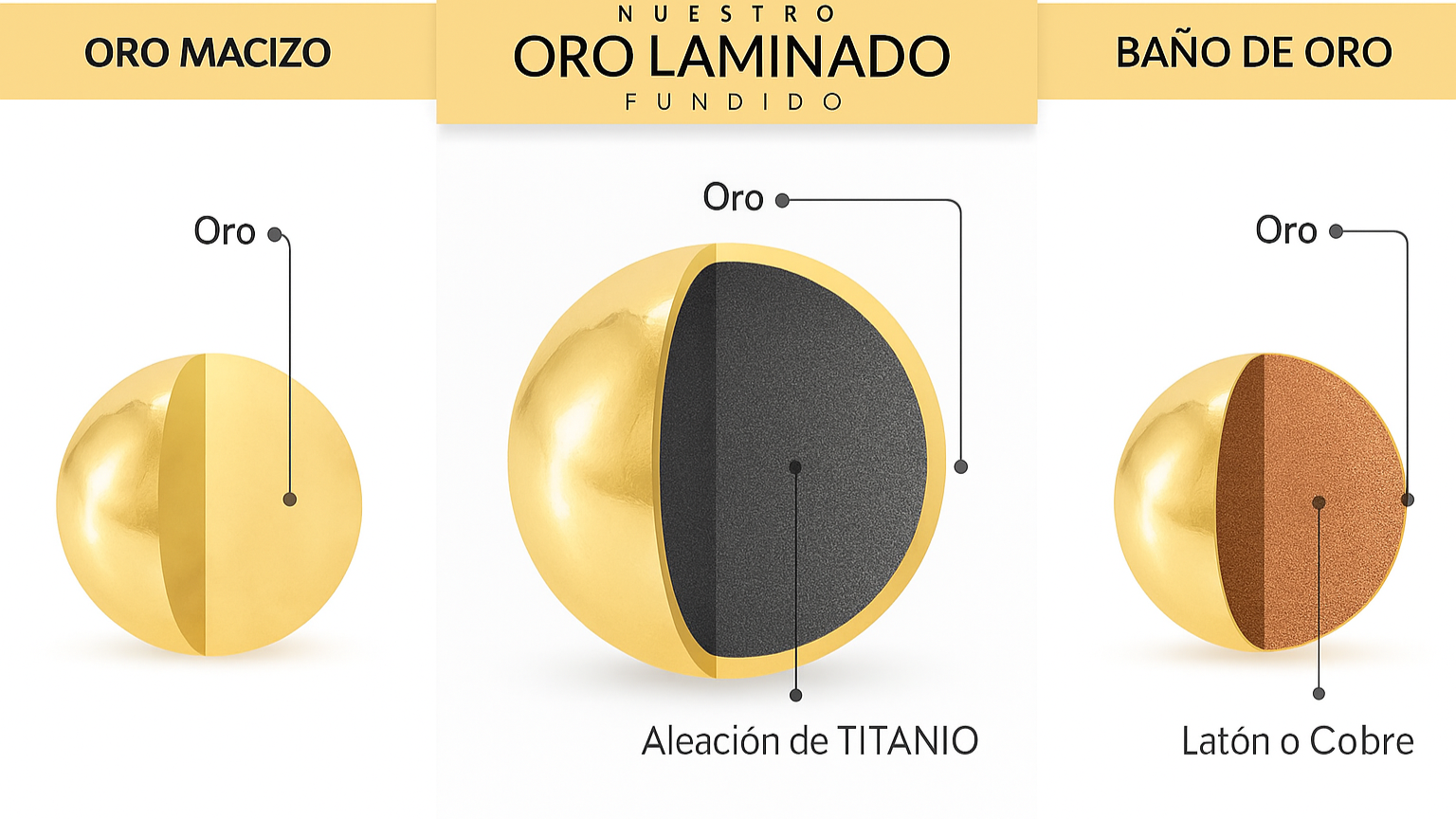 Cada pieza combina Oro 18 quilates fundido sobre aleación de titanio, garantizando un acabado duradero con el tono y brillo característicos del Oro Italiano.